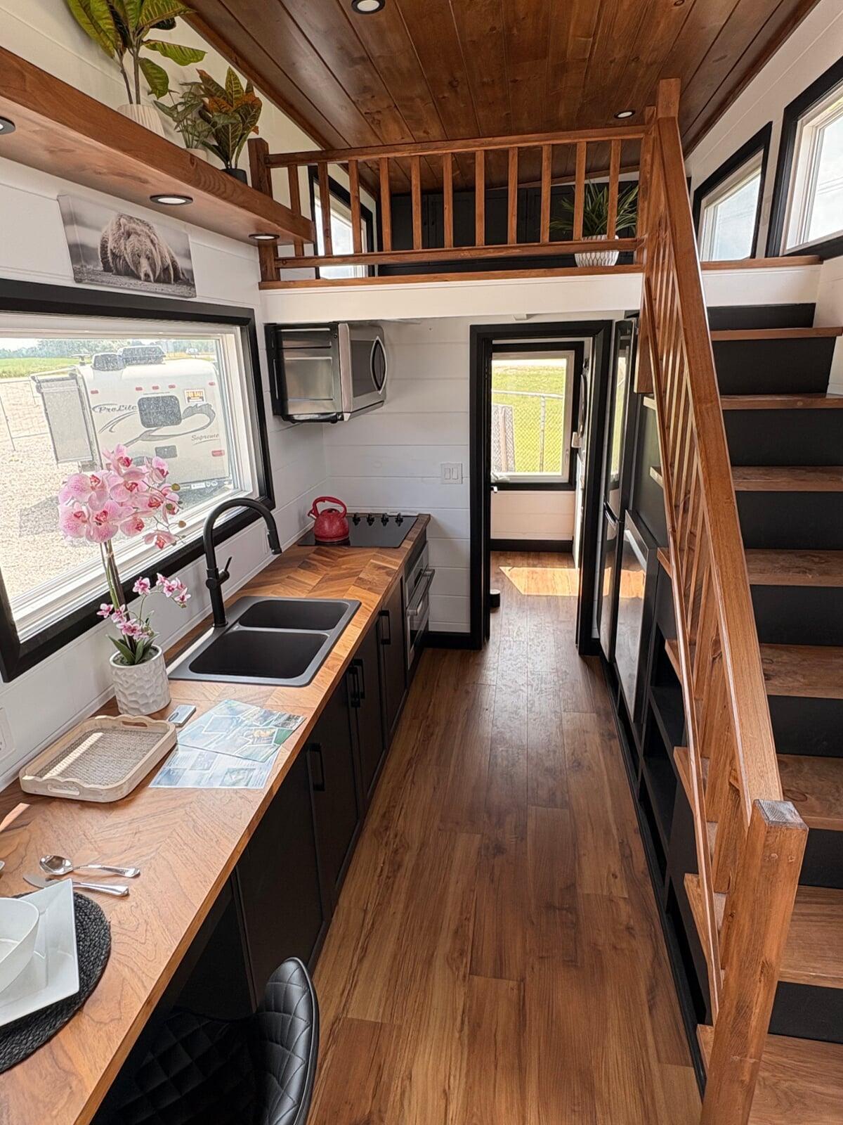 Inside, the Hudson features a walk-up queen loft, with the double-loft layout available in the $165,000 model. The space is bright and inviting, thanks to ten large windows, four of which open. High-end LG appliances and premium luxury vinyl flooring create a modern, durable interior that feels both stylish and practical.